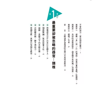 是時候來認識身體運作的原則和奧祕了!透過本書作者深入淺出的解釋,可以幫助大眾了解身體運作!明白頭部的位置,如何影響身體其他各個部位的連動?又如何在我們不自覺的狀況下,造成肌肉緊繃?甚至是如何影響我們情緒的反應?還可以了解在坐姿、站姿、走路時,用什麼樣的思維概念,能更輕鬆的使用身體?坐姿、站姿、走路,是一般生活中常會使用到的姿勢和動作,書中提出很實用的使用方法與意象概念,幫助讀者找到最自然的身體使用方式,清楚的講解與照片,十分生動易懂。
