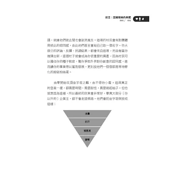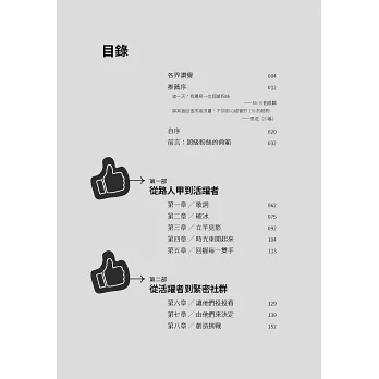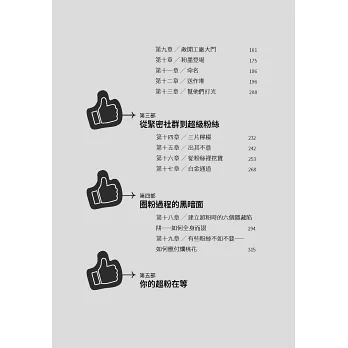 1. 本書分成五大部分、共19章節,除了以循序漸進的方式告訴讀者如何培養粉絲和吸引顧客外,在每個章節的最後都有應用練習,加強實用性。