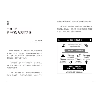 《不會表達,你的努力一文不值》把職場中很多抽象的規則,非常具體的描述出來,並將不同方法互相比較,讓人可以一目了然的選擇最適合當下情境的策略。讓你在對的時候,做出對的努力。