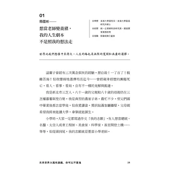 在瞬息萬變的時代,如何保證今天所學在未來還管用?今日熱門的大學科系不見得是未來邁向成功的門票。面對不可測的未來,個人應該具備什麼心態以確保在未來不會當鬼?