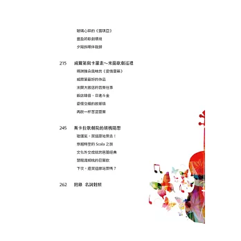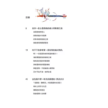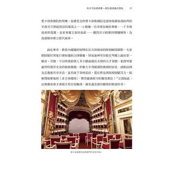 此外,拿起這本書的你或許也曾經對某些城市擁有獨特回憶,或者是將來想造訪該地的心願,因而我盡可能在每篇文章的尾頁空下一方優雅筆記格,希望讀者能在讀罷文字、聽完樂曲的時刻記下閱讀歷程的意識流,可以是過往回顧,可以是將來願想,這方筆記格是邀請大家和我共同成就一本家中書架上獨一無二、個人專屬歌劇旅遊書的心念,透過回應閱讀的書寫,觀照藝術賜予靈魂的感動。