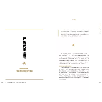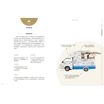 攤車、三輪車、餐車、胖卡、美式餐車,始於街頭的行動餐車文化,為愛吃的寶島台灣注入無窮活力。它們深入商辦、民生社區、市集、企業活動、偏鄉……用意想不到的美食,從內裝到外觀都充滿個人態度的行動餐車,開啟屬於自己的餐飲大亨之路。