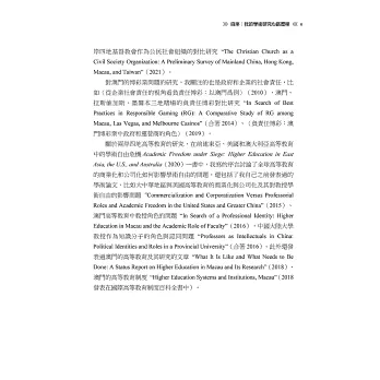 關於兩岸四地高等教育的研究,在前述東亞、美國和澳大利亞高等教育中的學術自由危機Academic Freedom under Siege: Higher Education in East Asia, the U.S., and Australia(2020)一書中,我寫的序言討論了全球高等教育的商業化和公司化如何影響學術自由的問題,還包括了我自己之前發表過的學術論文,比如大中華地區與美國高等教育的商業化與公司化及其對教授學術自由的影響問題“Commercialization and Corporatization Versus Professorial Roles and Academic Freedom in the United States and Greater China”(2015)、澳門高等教育中教授角色的問題 “In Search of a Professional Identity: Higher Education in Macau and the Academic Role of Faculty”(2016),中國大陸大學教授作為知識分子的角色與認同問題 “Professors as Intellectuals in China: Political Identities and Roles in a Provincial University”(合著2016)。此外還發表過澳門的高等教育及其研究的文章 “What It Is Like and What Needs to Be Done: A Status Report on Higher Education in Macau and Its Research”(2018)、澳門的高等教育制度 “Higher Education Systems and Institutions, Macau”(2018發表在國際高等教育制度百科全書中)。