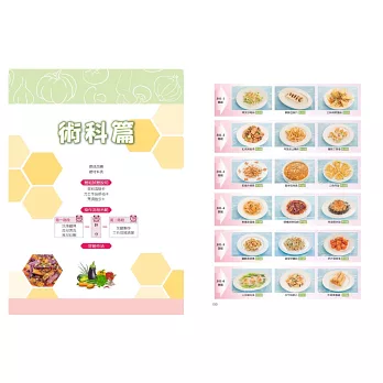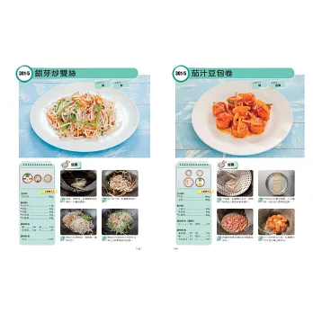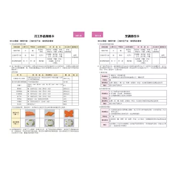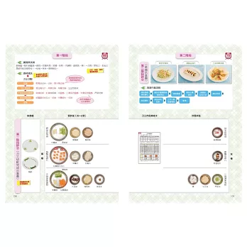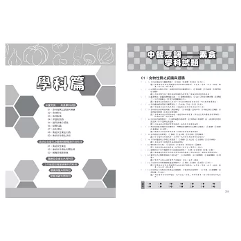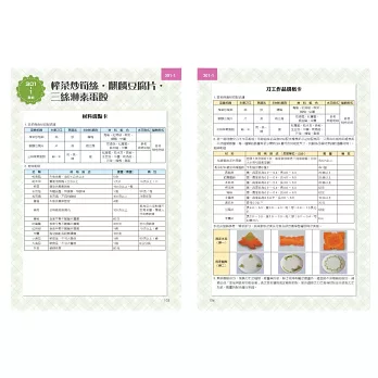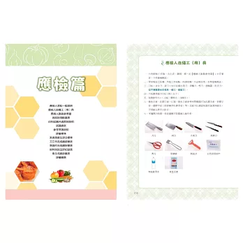 (三)術科篇:成品圖總覽對應頁碼、全組材料表、應檢必備三張題卡、刀工切配完整示意圖、重點烹調步驟提醒,讓您輕鬆了解應試流程、完全掌握烹調手法