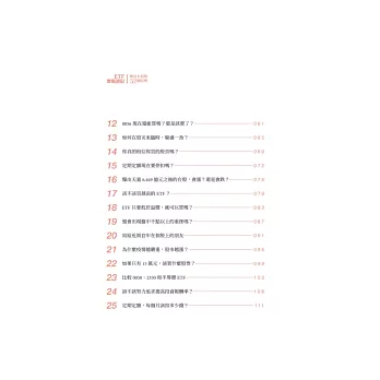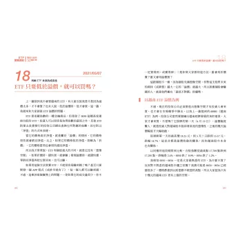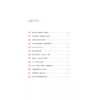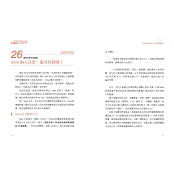 此外,網友常問起其他的ETF,我雖然沒買過,但也透過這些文章,提出我對一些新上市的ETF的看法。這本書的編輯,為求客觀完整,也在本書中增加了這些ETF的相關基本資料,提供給讀者們參考。