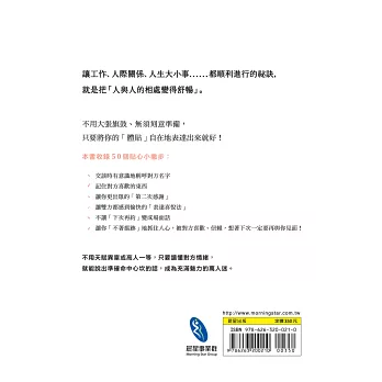 1.不需要特地上課或花大錢就能擁有→作者以長年主持經驗無私分享50則職場上、生活中「能夠考慮、照顧到他人需求」的待人接物能力