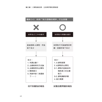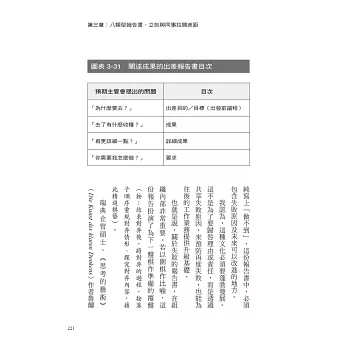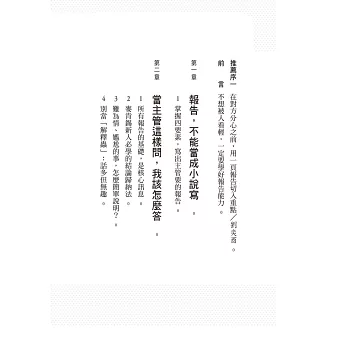 容易理解的架構、用目次回答對方的提問,並根據對方重視的方向來撰寫,作者在書中,點明做出好報告的3大關鍵,也給出具體的做法與案例解析,我覺得這就是本書最棒的部分。