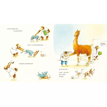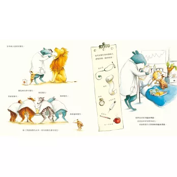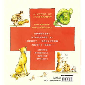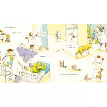 再有,對「動物」有更多的認識。本書的文字簡單,圖畫裡卻蘊藏了非常豐富的細節,從一開頭動物醫院的跨頁大圖開始,孩子可以來來回回在圖畫之間看到各式各樣的動物病人,他們會有什麼千奇百怪的毛病,醫生護士們又如何使出渾身解數來幫助這些病人,在一天結束之際,大家的問題皆可解決,病痛都獲得紓解。更細心的孩子,會去關心清潔工老鼠老是收拾不完的辛苦工作,也會跟著母雞去尋找她的蛋,數一數總共有幾顆蛋。再找一找,還有什麼動物的故事藏在其中呢!