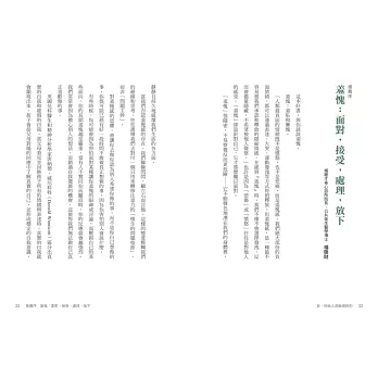 「羞愧」會引起對自己的嫌惡,牽動我們作為「人」最根本的尊嚴和信心。面對這樣一個最刺心的東西,要剖析它,又要向另一個人訴說,這都是很「反直觀」的事,在練習時也的確會有不快感,但這都是為了得到一顆更健康的心智的過程。