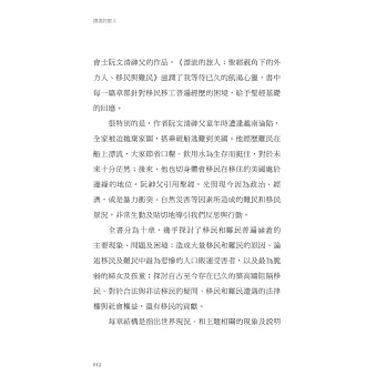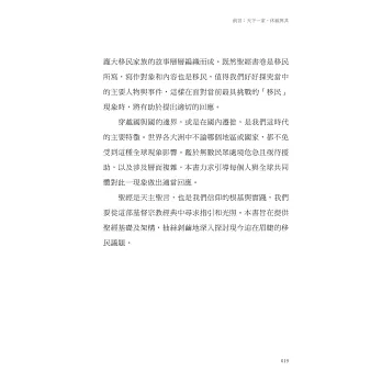 「立基於扎實的聖經學術和天主教社會倫理,刻畫移民的無奈悲慘,也提供積極的思考面向,開啟讀者的視野和胸襟,慷慨接納周圍最脆弱的弟兄姊妹。」──韋薇修女,前新事社會服務中心主任、天主教修會會長聯合會全人發展組執行祕書