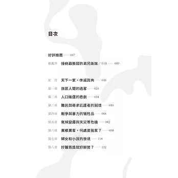 「簡明扼要點出各地移民與難民的困境,激發對社會正義的熱情,號召我們關心世界,重視人權及尊嚴,永遠與受壓迫者站在同一陣線。」──吳偉立神父,比利時籍聖母聖心會會士、天主教修會會長聯合會全人發展組召集人