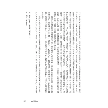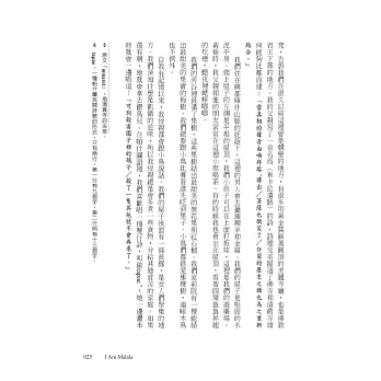 當我站在窗邊往外看,能看見高樓大廈,長長的道路上,車陣井然有序地移動著。樹叢和草皮都修剪得整整齊齊,還有平坦的人行道供人行走。我閉上眼睛,有那麼一刻我像是回到我的河谷了——山頭白雪靄靄的高山、綠意盎然的原野還有湛藍的河流——一想到史瓦特的人們,我的心就會愉快地微笑。我的心思帶著我回到學校,和我的老師還有同學團聚。我見到我最好的朋友莫妮芭,我們坐下來一起聊天談笑,好像我從沒離開過一樣。
