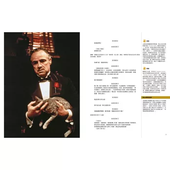 導演心法、製作秘辛與拍攝密技全數公開,柯波拉導演有一本貼著《教父》原著小說內頁,而周圍留出空白的導演筆記本,寫滿了他的創作要點與電影筆記,他稱之為「聖經」。而現在,讀者手上也有這樣一本以《教父》電影劇本為核心、周圍充滿著評註和圖解的「教父寶典」!