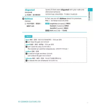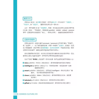 列有15個字義辨析專欄,將意義接近,但用法迥異的單字進行比較,並列出用法與例句,輕鬆釐清同義字的用法與不同之處。
