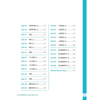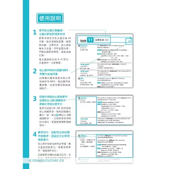選自大考中心針對108新課綱所頒布的《高中英文參考詞彙表》四~六級字彙,依主題分類編排,共16個主題,60個單元。每單元嚴選25–35個核心單字,延伸補充單字近義字與形近字,並搭配活用例句,讓你在短時間內輕鬆累積高中字彙量,戰勝大考單字!