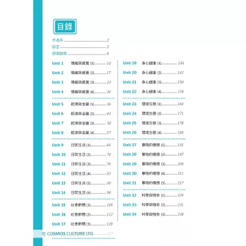 將單字依生活化主題分為16大類,包含情緒與感覺、經濟與金融、日常生活、身心健康、環境生態等多元主題。每主題更細分成4–6單元,每單元約有25–35個核心單字,分量適中,方便學習。各單字並延伸出數個近義字與形近字,觸類旁通進而加強記憶效果!