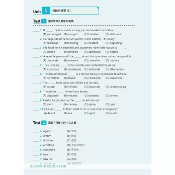 每單元後皆有字義選擇題與中譯搭配題,學習後立即測驗學習成效,針對不熟悉的部分進行補強。