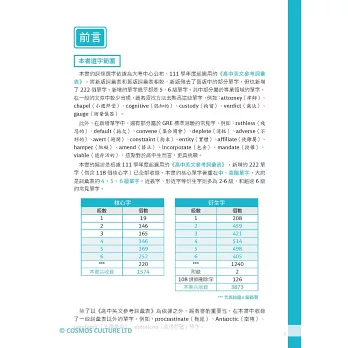 收錄大考中心高中進階字彙。選字更網羅近十年學測、指考字彙題單字,讓想考高分的學生輕鬆掌握大考必考單字範圍。