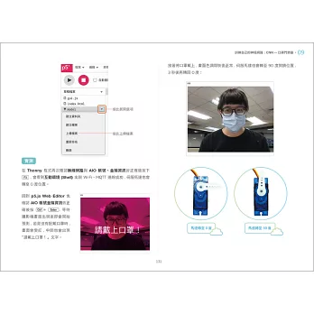 不同於常見機器學習皆是由 Python 語言實作, 本書使用 JavaScript 語言於瀏覽器實作機器學習, 搭配著名的 JS 機器學習函式庫 ml5.js 可以更快速且便利地達成 AI 網頁應用, 對於許多熟悉 JS 語言的前端工程師或使用者更為親近, 實驗過程使用 p5.js 程式庫, 讓沒有太多程式設計基礎的使用者也可以更輕鬆將結果視覺化, 再搭配使用 p5.js web editor 線上開發環境, 只需要使用瀏覽器就可以開始輕鬆設計網頁, 不需要在自己的主機建構繁瑣的開發環境, 再搭配 Python 編寫控制板程式, 將應用結合至感測器或實體輸出裝置, 實現更完整的機器學習應用實例。