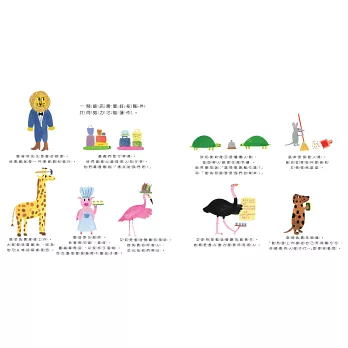 在幼兒遊戲中「角色扮演」特別常見,除了辦家家酒以外,扮演老闆賣商品的遊戲更是頻繁出現。顯示幼兒對於職業、工作擁有許多想像並深感興趣。此書依據動物特性賦予適合的職務,帶領孩子直擊飯店中各種有趣的工作內容。