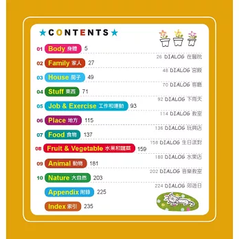 2. 全書共包含11個主題單元,包括身體、家人、房子、東西、工作和運動、地方、食物、水果和蔬菜、動物、大自然、和生活常識。