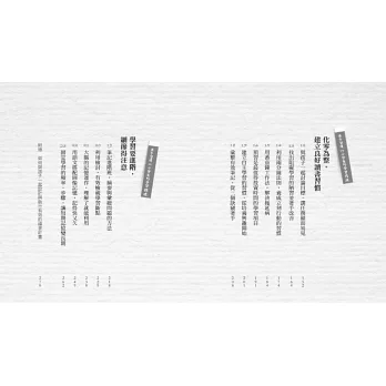 更甚者,趙老師透過本書,分別以正確心態、設定方向、建立習慣,到學習進階四大章節,從根本到策略,鉅細靡遺仿若與家長對話,懇切地分享自身經驗和建議的策略,既是務實的指引,更有著溫暖的陪伴。