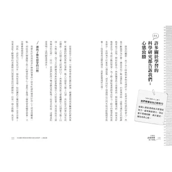 而每一篇章的「請師長這樣做」或「老師的心內話」,則清晰的再提一次該篇的重點,條列式的給予父母師長可行的建議,真可說是非常好上手的葵花寶典,有了這一本,就不必擔心怎麼跟孩子聊關於學習上的滿足與挫折。