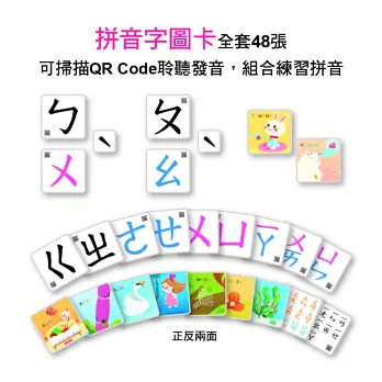 附48張拼音字圖卡,包含以不同顏色區分37個注音符號的「聲母」、「韻母」和「介音」,以及聲調符號,還特別設計ㄧㄨㄩ結合韻,提供家長活用陪伴孩子練習拼音。掃描QR Code音檔亦可聆聽每個注音符號的正確發音並跟讀,建議家長鼓勵孩子發揮創意一起動動腦玩接龍、九宮格、翻翻樂等遊戲,簡單多變趣味無窮!