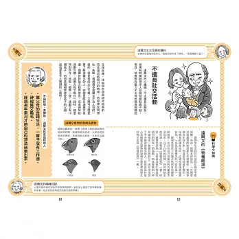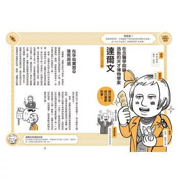 收錄了「只要說到這位科學家,就不能不知道的科學知識點」!例如談到「達爾文」,一定要提到他的演化論名作《物種起源》,以及他所發現的「鳥喙多樣性」(鳥嘴會因為鳥攝取的食物類型不同,而演化成不同模樣),所有的「知識點」都會搭配插畫和圖說文字,讓有點距離感的科普知識變得好懂、好理解!