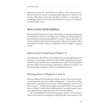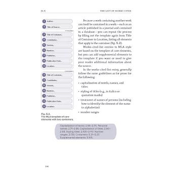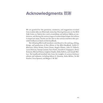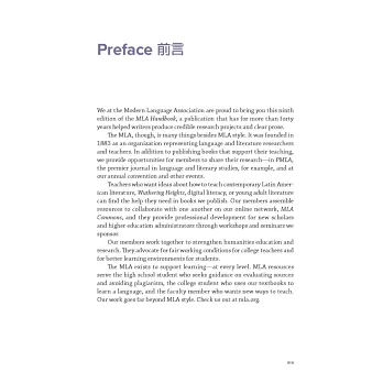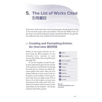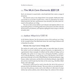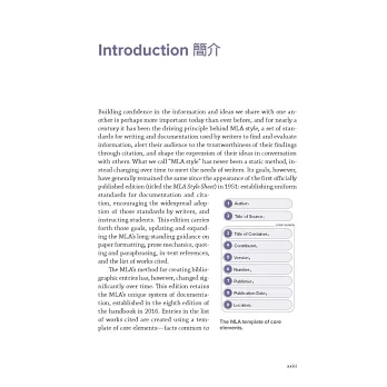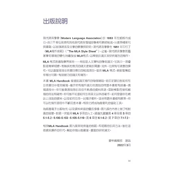 7. 為順應電子出版時代,以及資料來源的靈活多樣,第九版在內容上做了相對應的調整。對第一次使用MLA 手冊的人士,建議先瀏覽第4章及第5章的5.1-5.2,5.100-5.103,5.105-5.119,第6章的6.1-6.2,第7章的7.1-7.2。