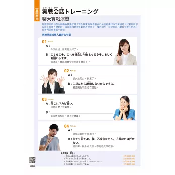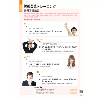 本書最後的實戰演習考驗你是否真的吸收了句型精隨,透過完成題目的兩人對話,來檢視自己對句型的掌握情況,若不盡理想也別忘了回頭複習喔!
