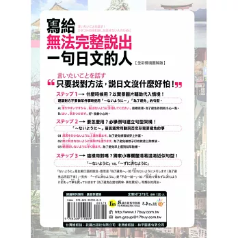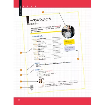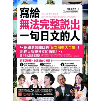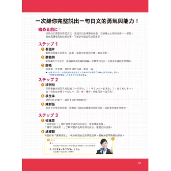 本書依照功能分門別類,共收錄300個常用日文句型,每個句型都搭配了全彩實景圖片,一秒代入對話情境。圖像記憶也能幫助你在第一時間想起要用的句型。