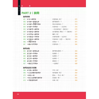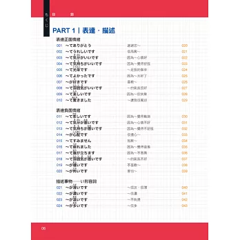 本書共分為七大類,包括「表達.描述」、「詢問」、「否定」、「假設」、「感嘆.誇讚」、「味道」和「負面詞彙」,共300個句型,涵蓋生活中常用到的大部分情境。在每個分類之下又再細分為各式對答會使用的句型,你可以在需要的時候快速找到對應句型。
