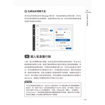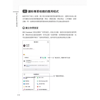 我的臉書行銷初體驗:相機、限時動態、視訊直播、新增聊天室、發佈動態消息、即時聊天、標註人物、建立活動/社團/粉絲專頁、管理朋友名單與群組。