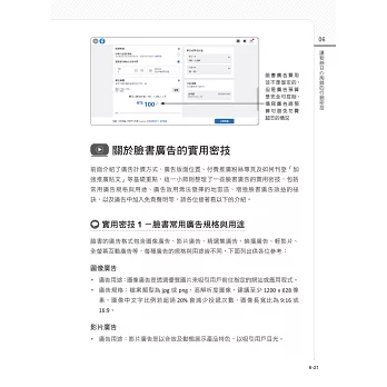讓粉絲甘心掏錢的行銷密技:臉書行銷五部曲、免費廣告與付費廣告、常用廣告規格與用途、自訂廣告受眾,投放廣告有效果,臉書如何與Instagram整合使用。