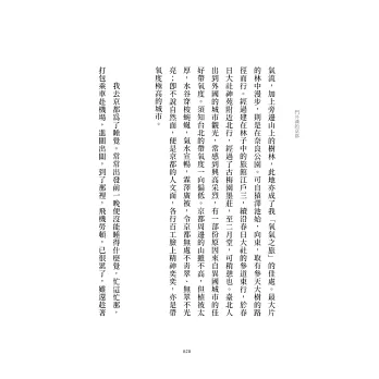 京都古城的旅店長牆、名川美寺,甚至閭巷間的柿果低垂,松枝斜倚,在他筆下無不風情獨具,歷歷如繪。他捨棄厚重綿密的敘述,不貪巨幅,奉行的是「少就是多」、「小即是美」的美學。文字是文言白話的混搭風,雅俗相生,老神在在。——張瑞芬