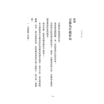 ★全新版本收錄序文〈京都喚出我的發現心〉,以及〈京都的水〉、〈整個城市是一大公園〉、卷末彩頁〈京都為什麼好玩〉與30餘幀照片