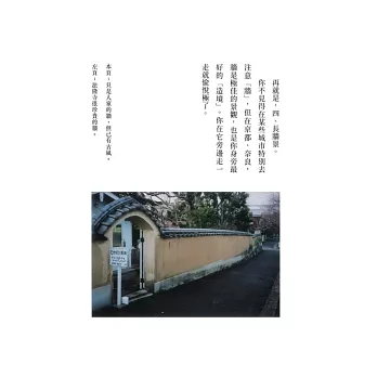 京都另一最大風景資產(除了山門),是長牆。人依傍著它踽踽行走,似永走之不盡,此種寬銀幕畫面,是世上最美的景。這無數堵的牆、直統統的到底、卻一轉折又是重新的無盡,便教西方千百雄麗城鎮無法與京都頑頡,也令京都在氣氛上堪稱舉世最獨一無二的城市。