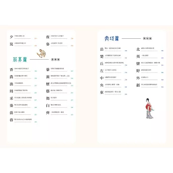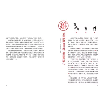 藉由一個個漢字的深入研究,本書以最淺顯有趣的一則則小篇章,呈現三千多年前古人對世界的觀察,讓你了解古人如何看待蟲魚鳥獸、花花草草,以及如何觀察地形景觀和大自然的變化。