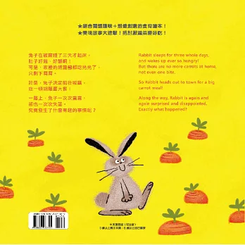 《很餓很餓的兔子》這本書,是一隻肚子餓的兔子尋找胡蘿蔔的旅程,在途中遇到的景物,引發了兔子種種的聯想和傻氣舉動。希望讀完故事的小讀者,在將來吃胡蘿蔔時,會因為這個有趣的故事,對胡蘿蔔產生興趣,給自己一個嘗試的機會,進而愛上吃胡蘿蔔吧!