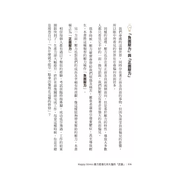 多數一聽到「壓力」就會直覺是負面的,但就健康心理學角度,適度的壓力反而能增進表現。作者把壓力區分為正向和負向,讓我們嘗試去發掘壓力好的那一面,最大的差別在於怎麼轉念解讀,選擇用什麼姿態面對?並引導讀者如何將外在訊息與內心狀態調和,讓大腦與身心健康達到平衡穩定狀態。面對壓力「如果不喜歡,那就改變,如果改變不了,那就適應」。這本書分享了怎麼改變?怎麼轉念?怎麼適應。想擁有快樂是需要練習,本書作者教你面對Stress的事情,怎麼做仍能保持Happy的心情。