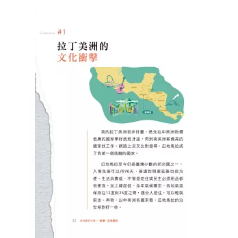 瓜地馬拉是旅途的起始站,在天堂般的湖畔小鎮,她與嬉皮一同活在當下。在伸手不見五指的石灰岩洞穴探險、在數千年的馬雅叢林遺跡裡迷路、在加勒比海克服旱鴨子的恐懼學會潛水。