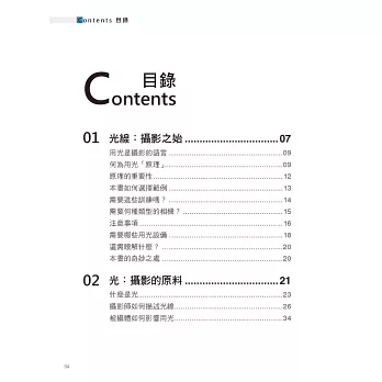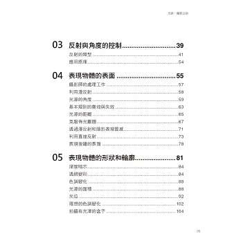 我們將在第2章和第3章詳細討論這些基本原理。這些原理同樣適用於其他被攝物件的拍攝。在下面的章節中,會運用這些原理來拍攝各種物件。這裡簡單歸納如下: