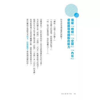這聽起來是否非常不可思議?但你可以試著回想自己曾經是否有過非常專注投入做一件事情時,感覺像是過了一整天,回過神來才發現其實才過沒多久的經驗?就像是進入了《靈魂急轉彎》這部電影中所說的ZONE,也就是本書所提到的「零點場」,當我們集中精神全神貫注進入這個場域時,時間就會增加,就會變慢。