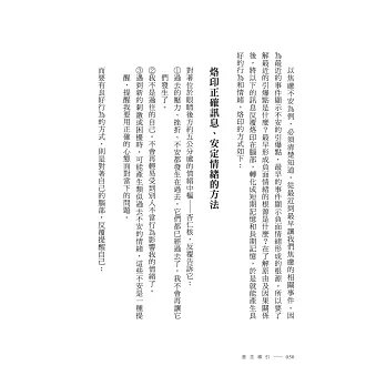 藉由抒解負面情緒並灌入正確觀念和方法,就能將恐懼不安的苦難煩憂連根拔掉。