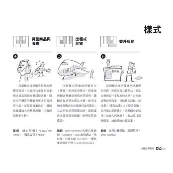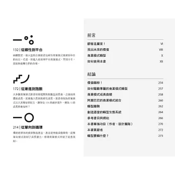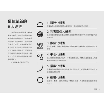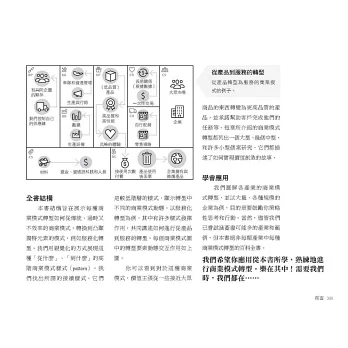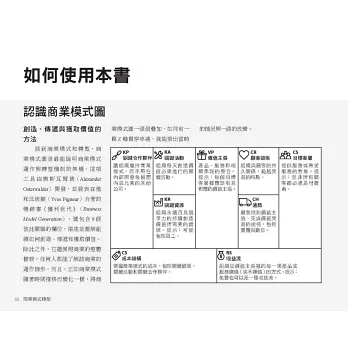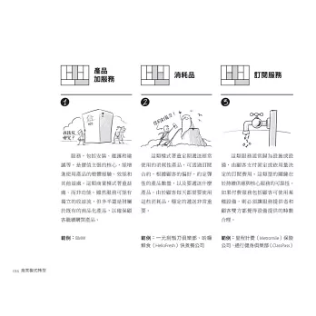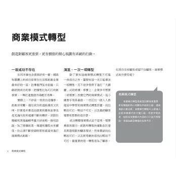 本書每一章圖解一種商業模式轉型,涵蓋大型、中型和小型個案,引導你如何看見與發現新的顧客需求,研判轉型方案的可行性。