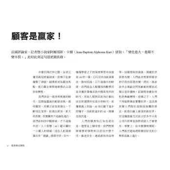 後疫情時代,用傳統觀點思考,很難面對快速變化的數位環境,企業想要成長,必須尋找新的商業模式,進行根本的轉型。推薦想要找到方法思考未來的經營者,都來看這本書。——中華汽車企劃管理事業群副總經理 錢經武