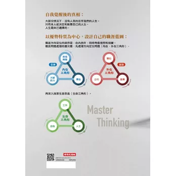 如果人生80年,扣除前20年學生、後20年退休,至少有近一半的時間是工作,如果你無法在職涯發展中找到成就感與快樂,那麼人生將是多麼的苦悶,而這本《主人思維》將幫助你勇敢為自己職涯做主,給你職涯發展策略,讓你選擇想走的路。――鄭俊德