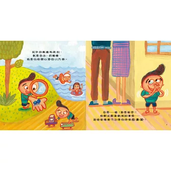 《不可以!這是壞習慣!》便生動地呈現了一個有挖鼻孔習慣的孩子──民宇的日常。民宇總是右手挖完左手挖,再雙手挖,然後吃掉;隨手一黏,鼻屎便成了裝飾的工具,而在夢中,鼻屎甚至變成了各種玩具跟玩伴們。