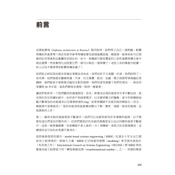 《Software Architecture in Practice》是一本實用且經過驗證的現代軟體架構權威指南,第四版加入了關於行動性、雲端、能源管理、DevOps、量子計算的內容,以及十一篇新章節。本書徹底解釋何謂軟體架構、為何它很重要,以及如何以嚴謹且有效的方式進行設計、實例化、分析、演變與管理軟體架構。